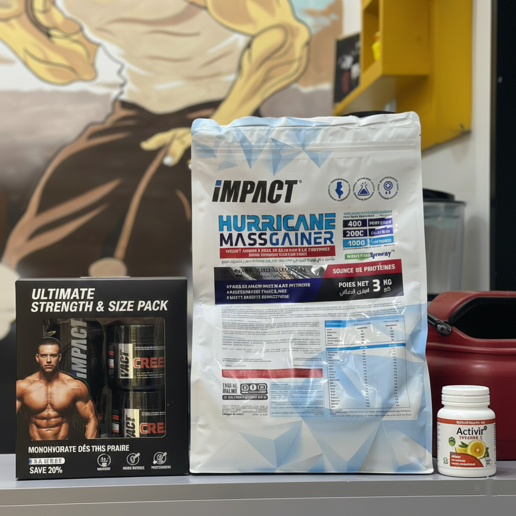 -Hurricane Mass Gainer (3 kg) : Le pilier de votre nutrition. Formulé pour apporter les calories et les protéines nécessaires à une croissance musculaire rapide et une recharge énergétique maximale après l'effort.